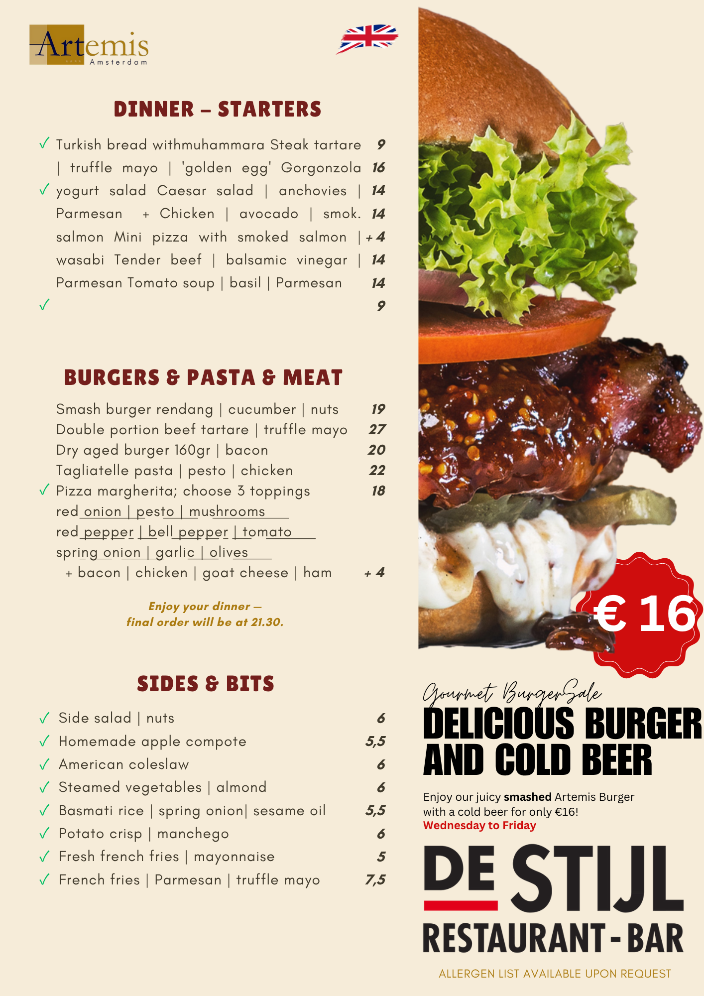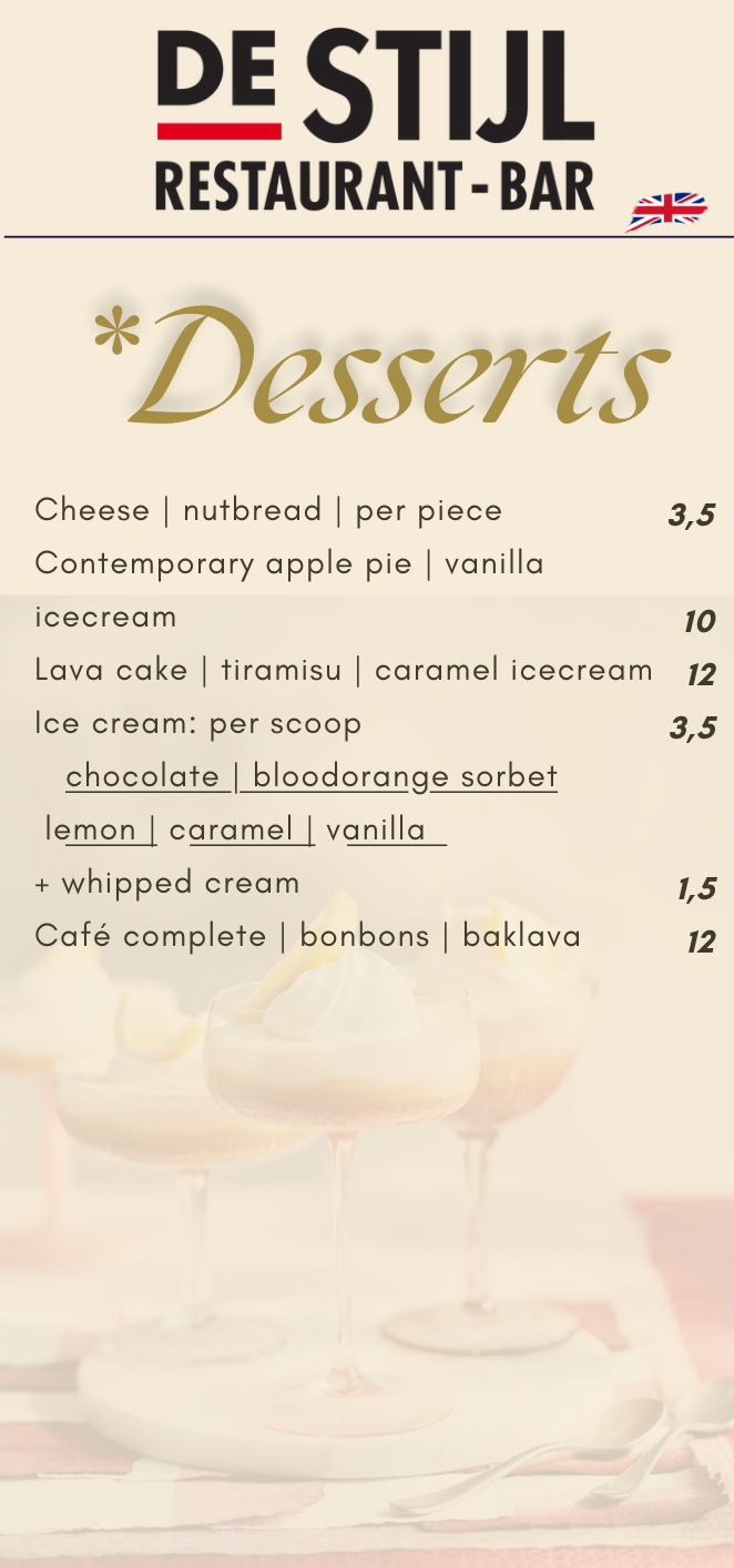 Déjeuner tardif et dîner est servi du lundi au vendredi de 14h00 à 21h30. Notre menu propose des entrées savoureuses, des plats principaux satisfaisants et des desserts gourmands, tous préparés avec des ingrédients frais et une touche de créativité. Que vous ayez envie d’un repas copieux ou de quelque chose de plus raffiné, nous avons de quoi satisfaire tous les palais. Accompagnez votre dîner d’une sélection de notre carte des boissons et profitez d’une soirée détendue autour d’un bon repas, de boissons et d’une bonne compagnie.