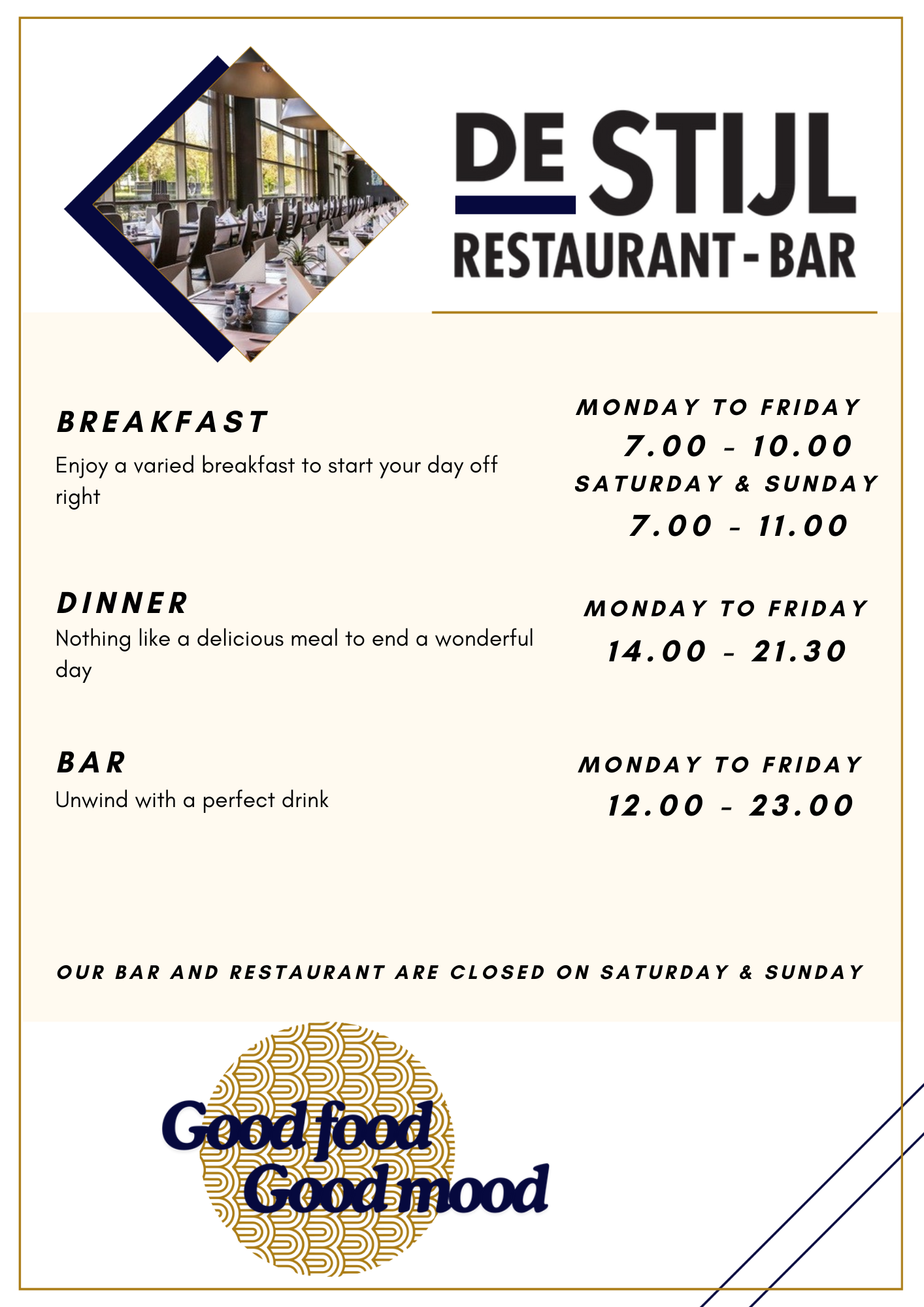 Le restaurant-bar De Stijl est ouvert pour le petit-déjeuner, déjeuner tardif et le dîner.