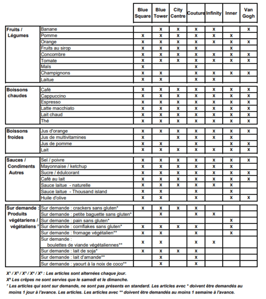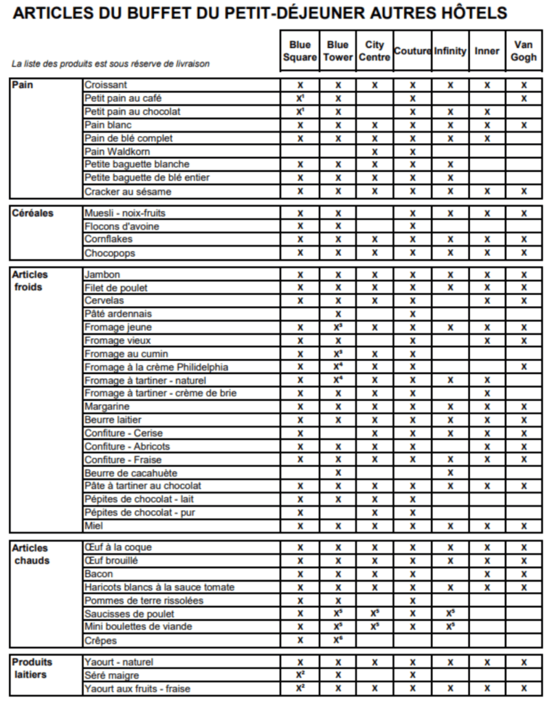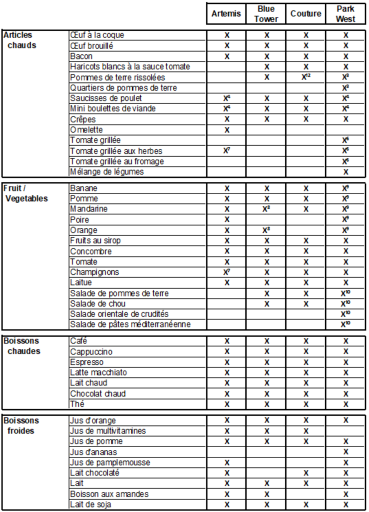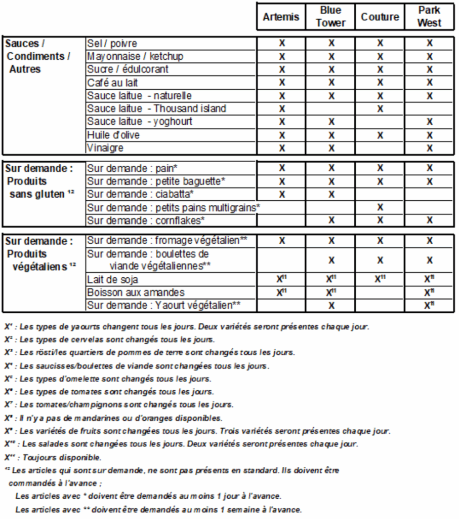 N’oubliez pas que la liste des produits de notre buffet de petit-déjeuner peut varier en fonction de la disponibilité chez le fournisseur.