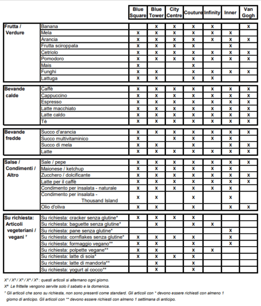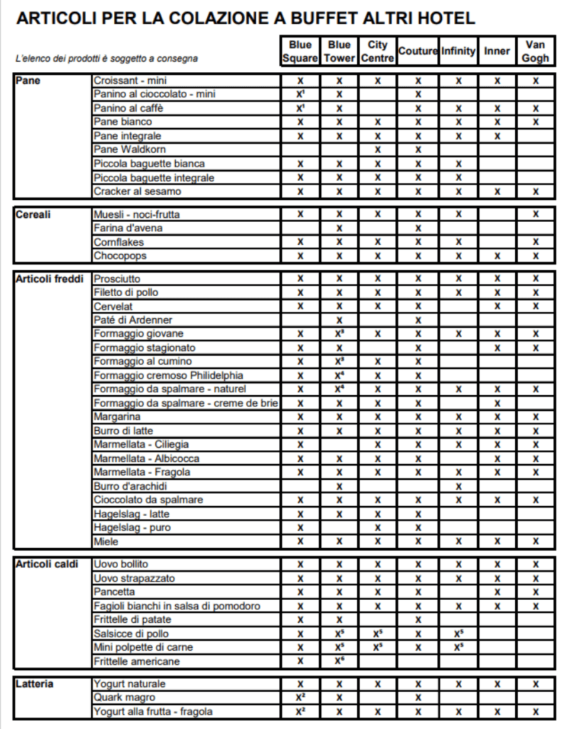 Tenete presente che l’elenco dei prodotti per la colazione a buffet può variare in base alla disponibilità del fornitore.