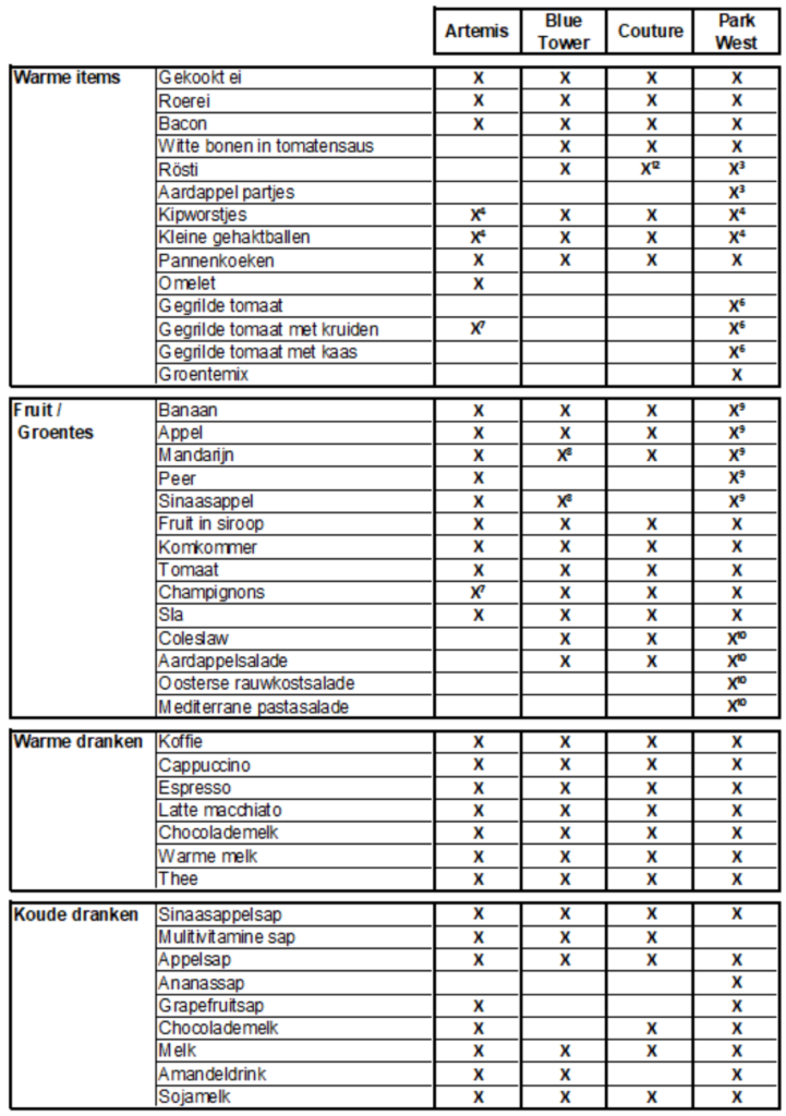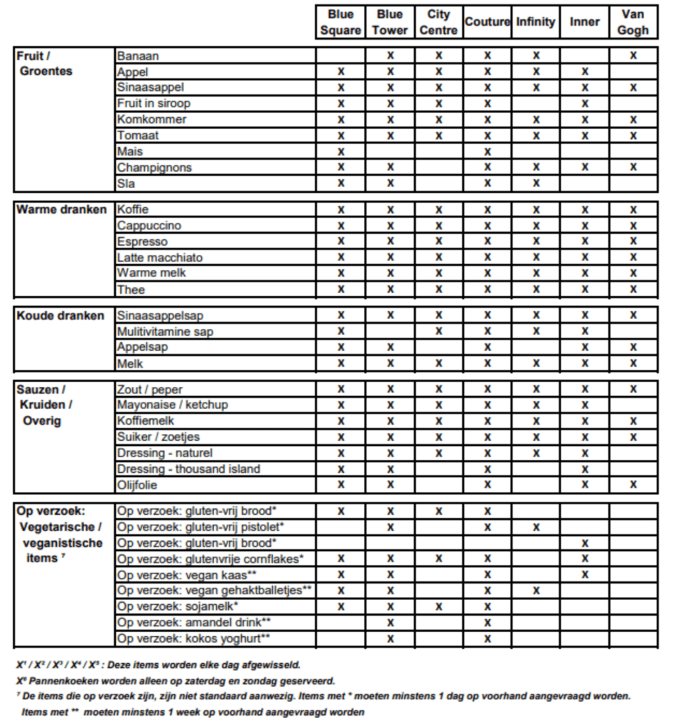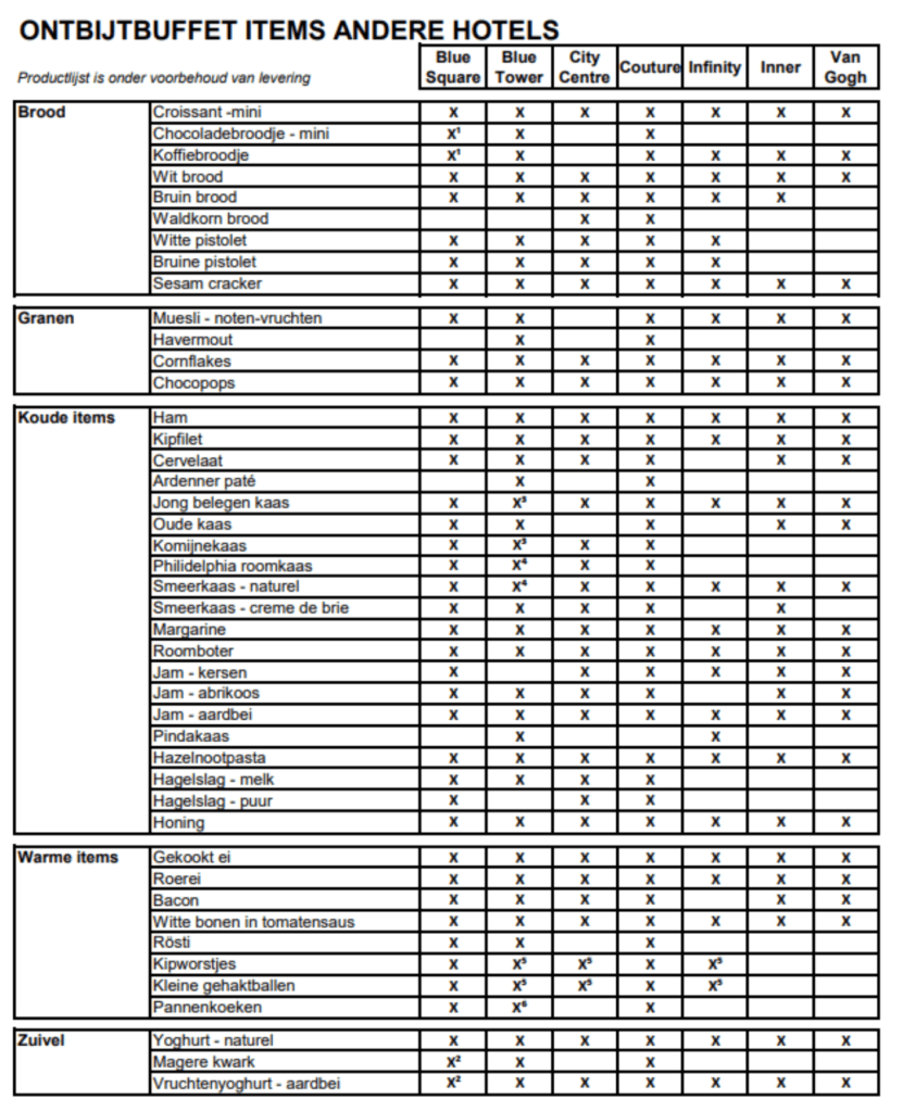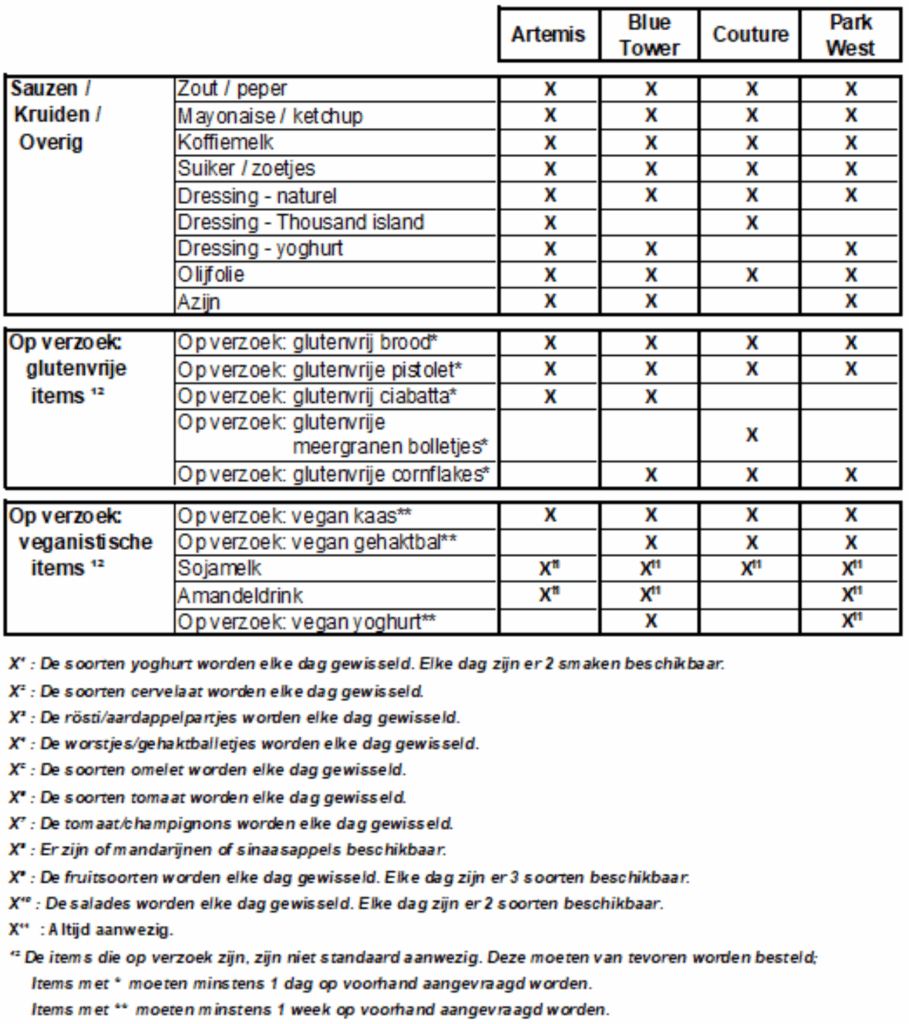 Houd er rekening mee dat de lijst met producten voor ons ontbijtbuffet kan variëren vanwege de leveringsafhankelijkheid.