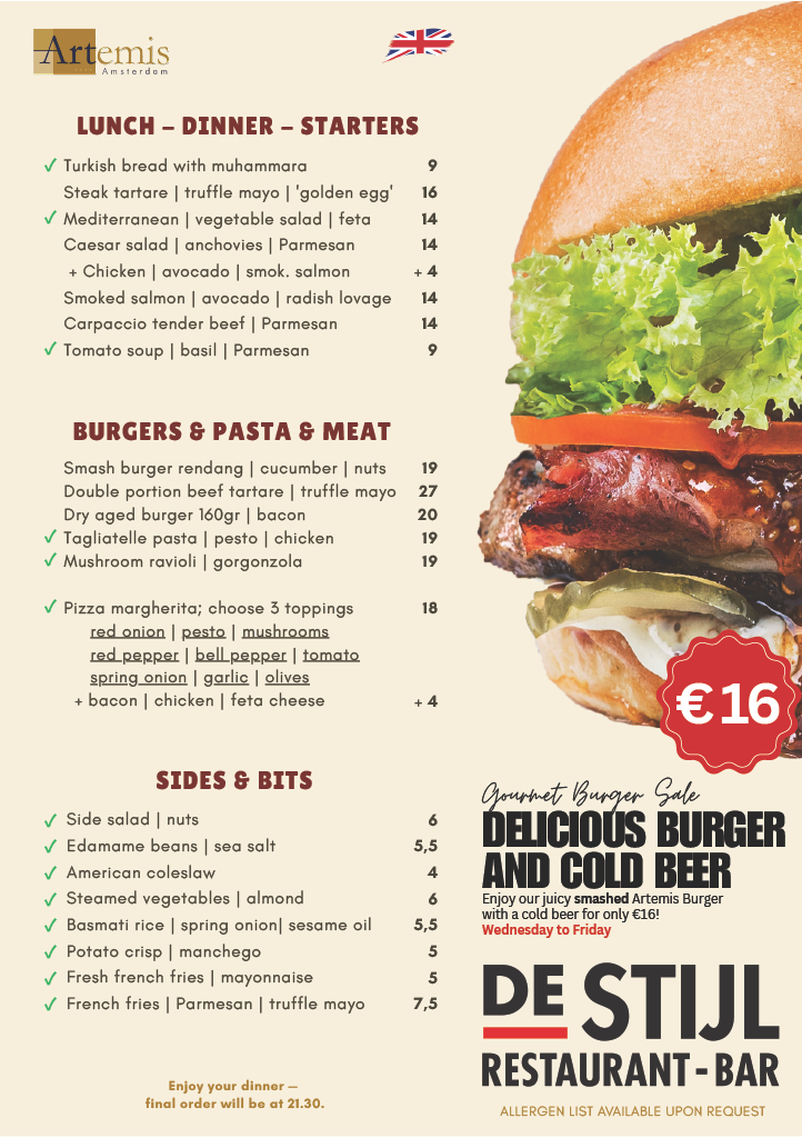 De Stijl餐厅酒吧提供早餐、午后午餐、晚餐、饮品及小食服务。
